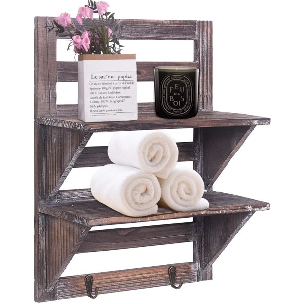 Enter zip code for a better delivery estimate. 5 out of 5 stars. Made of solid wood with process of torched finish, and black metal bracket after powder coated, also come with a wood bar and 8 sturdy hooks for kitchen or bathroom kitchen countertop and cabinet shelf: White rustic wood wall shelf with hooks is made of wood and features a thick rectangle shelf with a light brown color on top and black tinged sides. Kate and laurel jeran wood wall shelf with hooks.